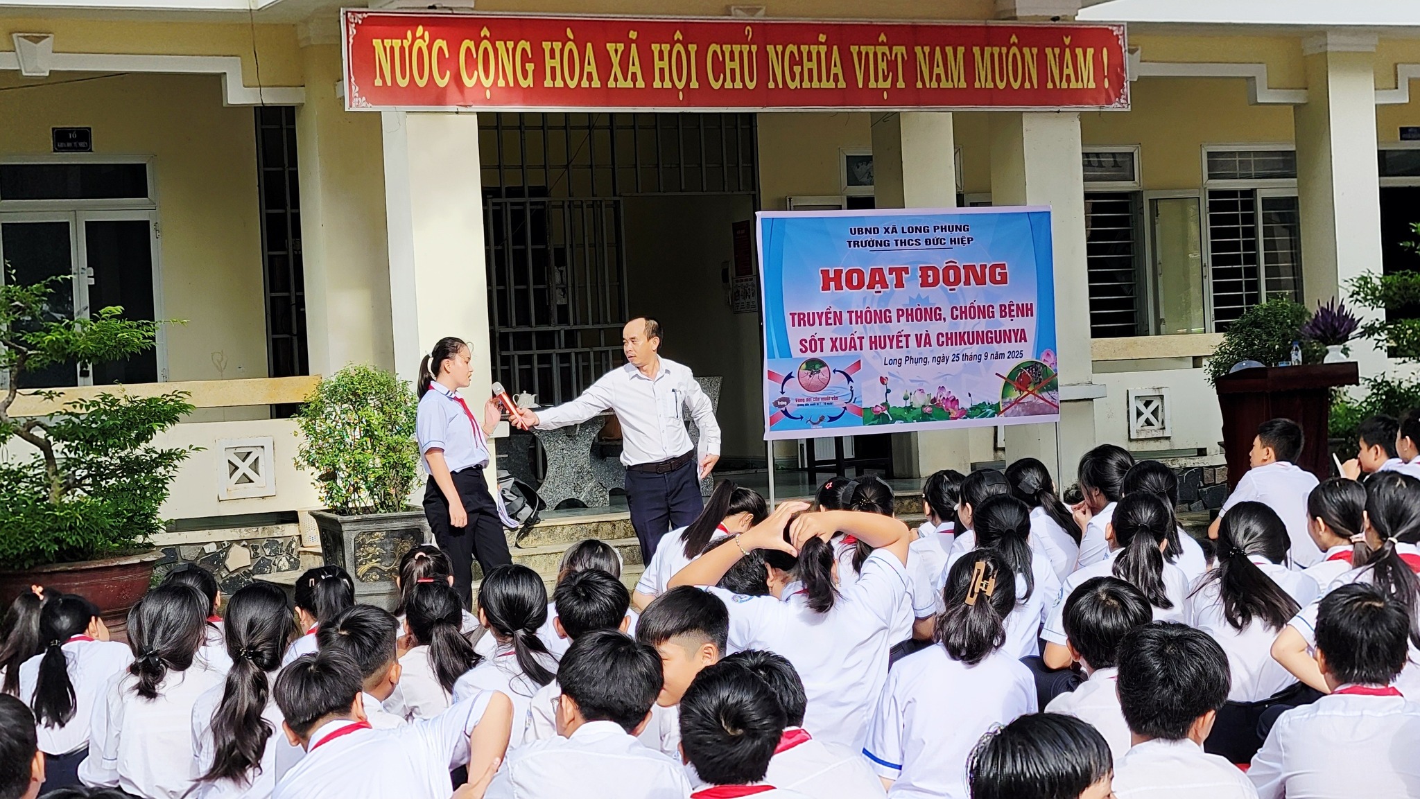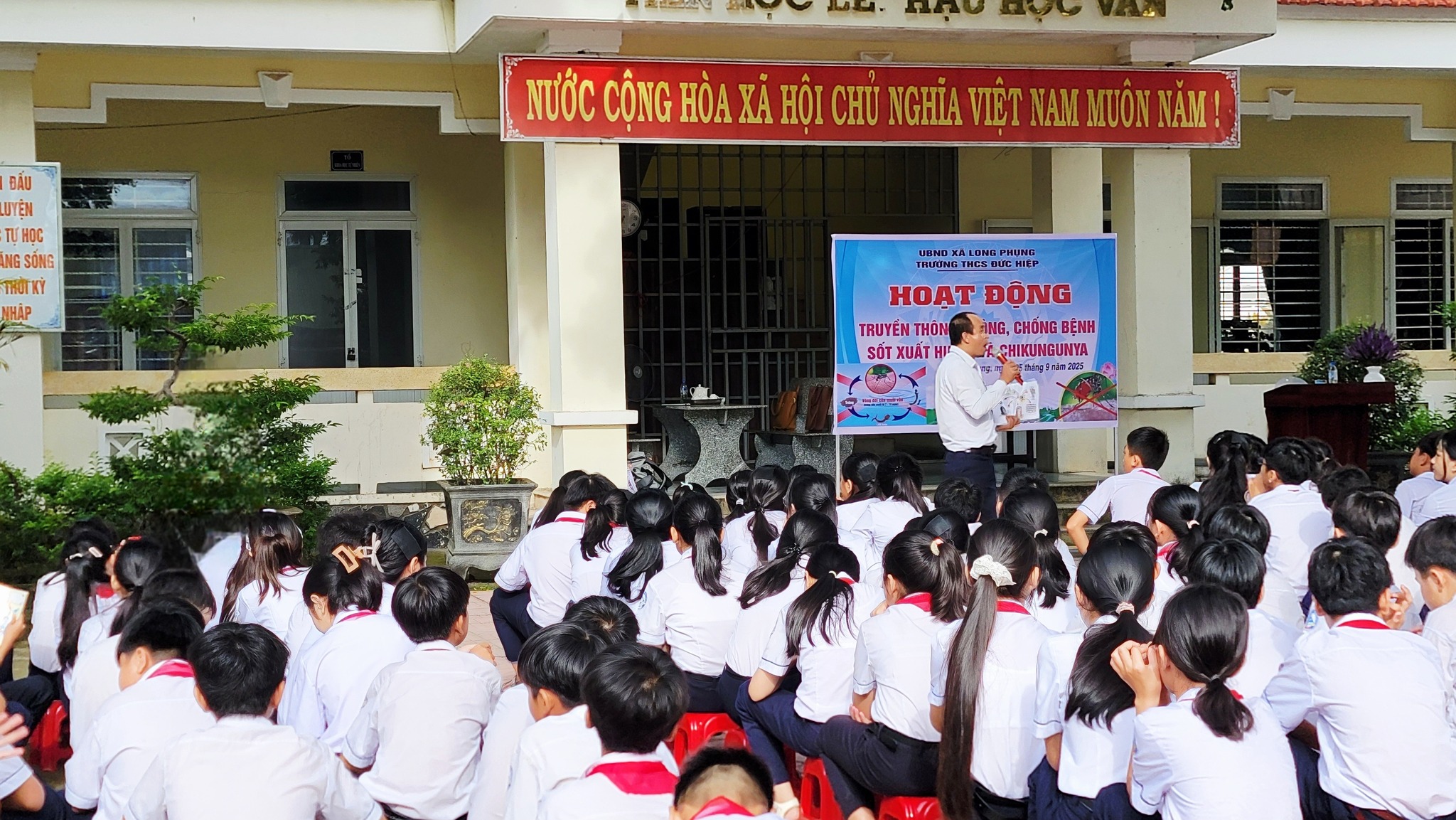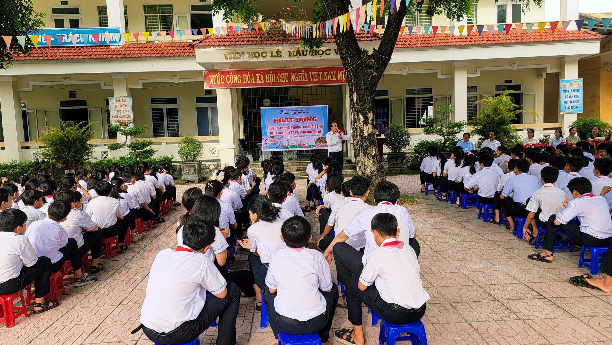 Hoạt động truyền thông phòng, chống dịch bệnh sốt xuất huyết. Sáng ngày 25/09/2025 tại Liên đội, Trung tâm phòng, chống dịch bệnh Tỉnh Quảng Ngãi về có buổi giao lưu tuyên truyền Bệnh sốt xuất huyết và Chikungunya cho hơn 300 học sinh và toàn thể CBGVNV trong nhà trường. Qua buổi giao lưu, tuyên truyền các em không những có được kiến thức về nguyên nhân của bệnh sốt xuất huyết mà còn biết cách hướng dẫn mọi người cách phòng tránh dịch bệnh hiệu quả.