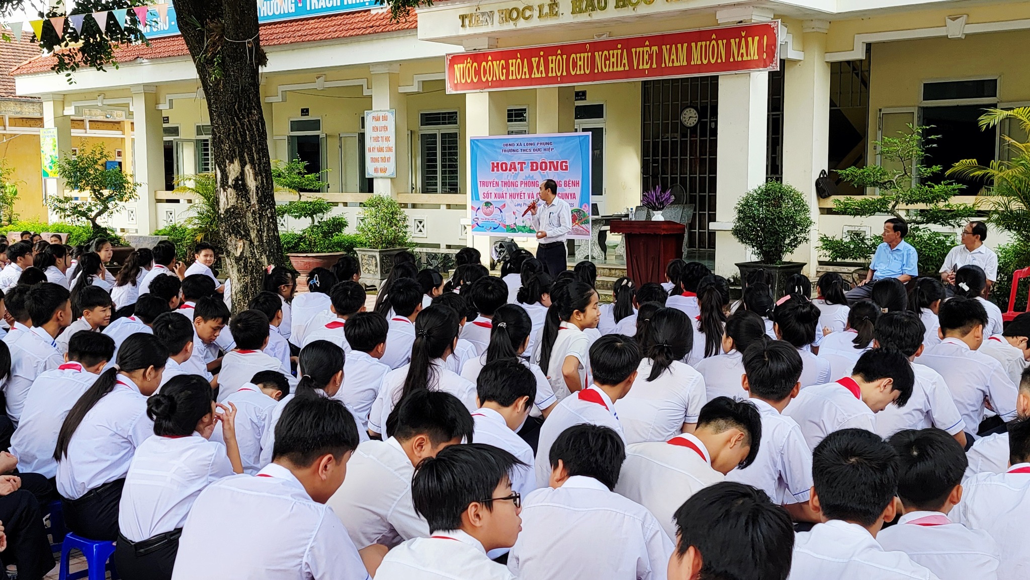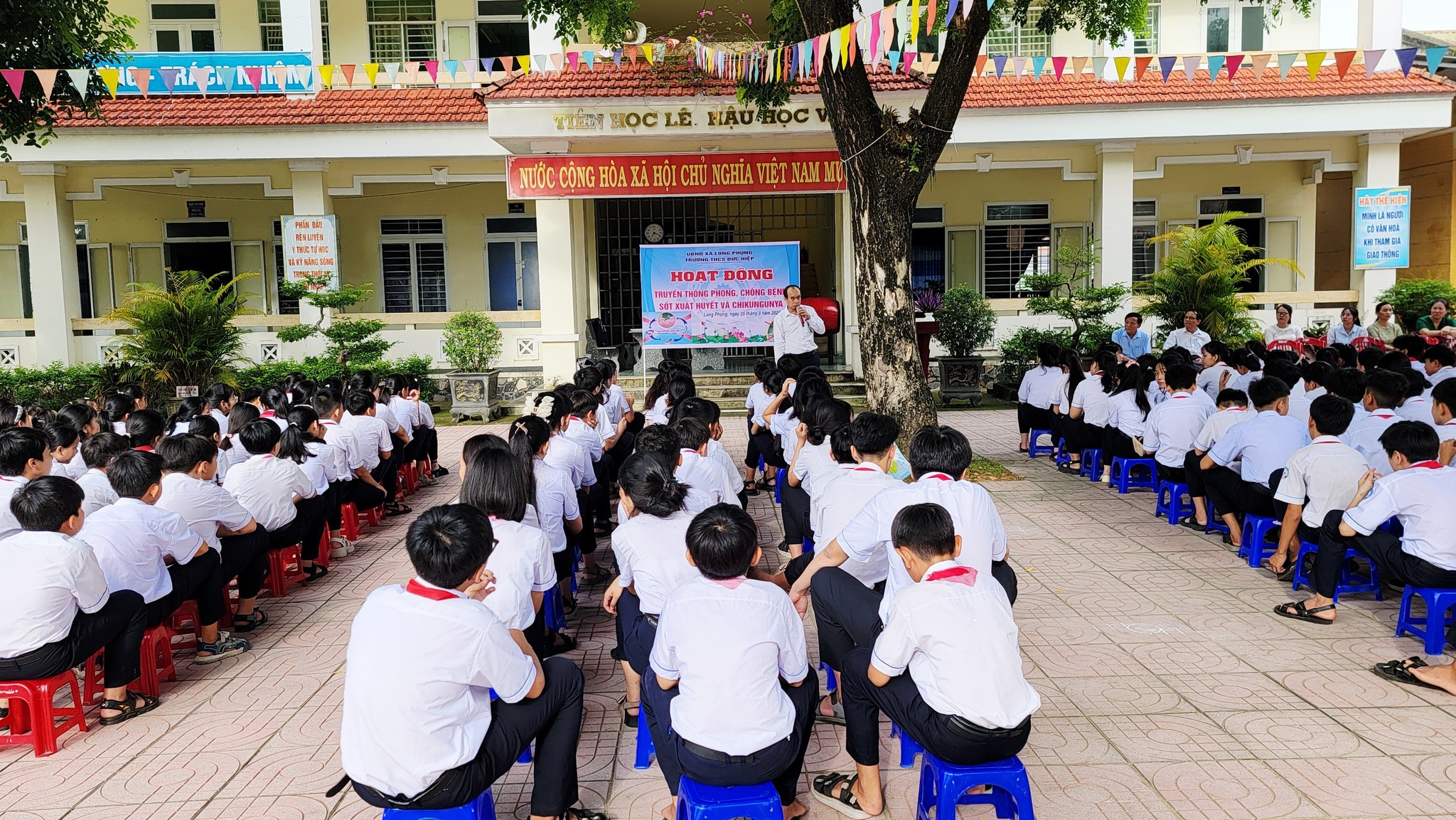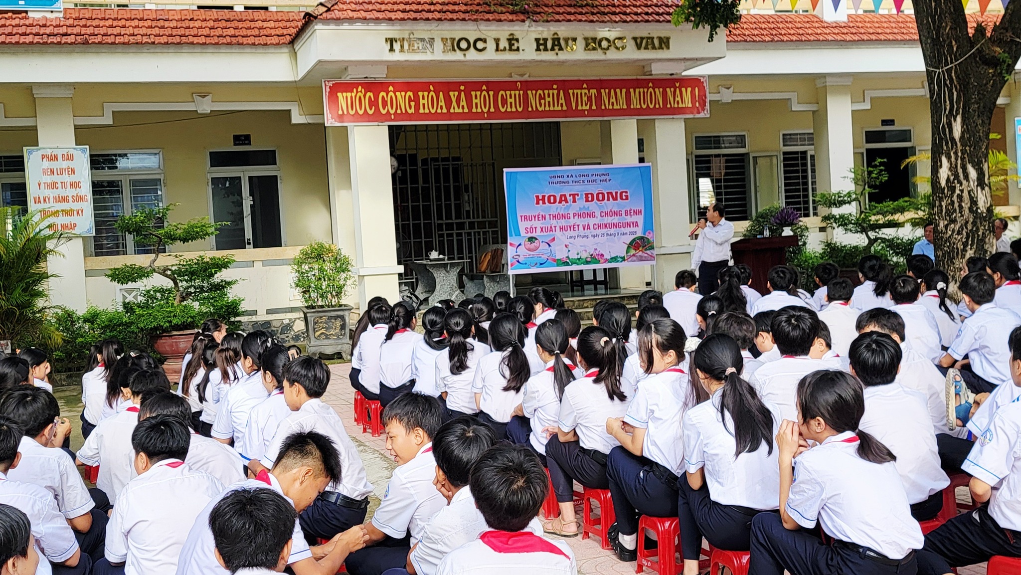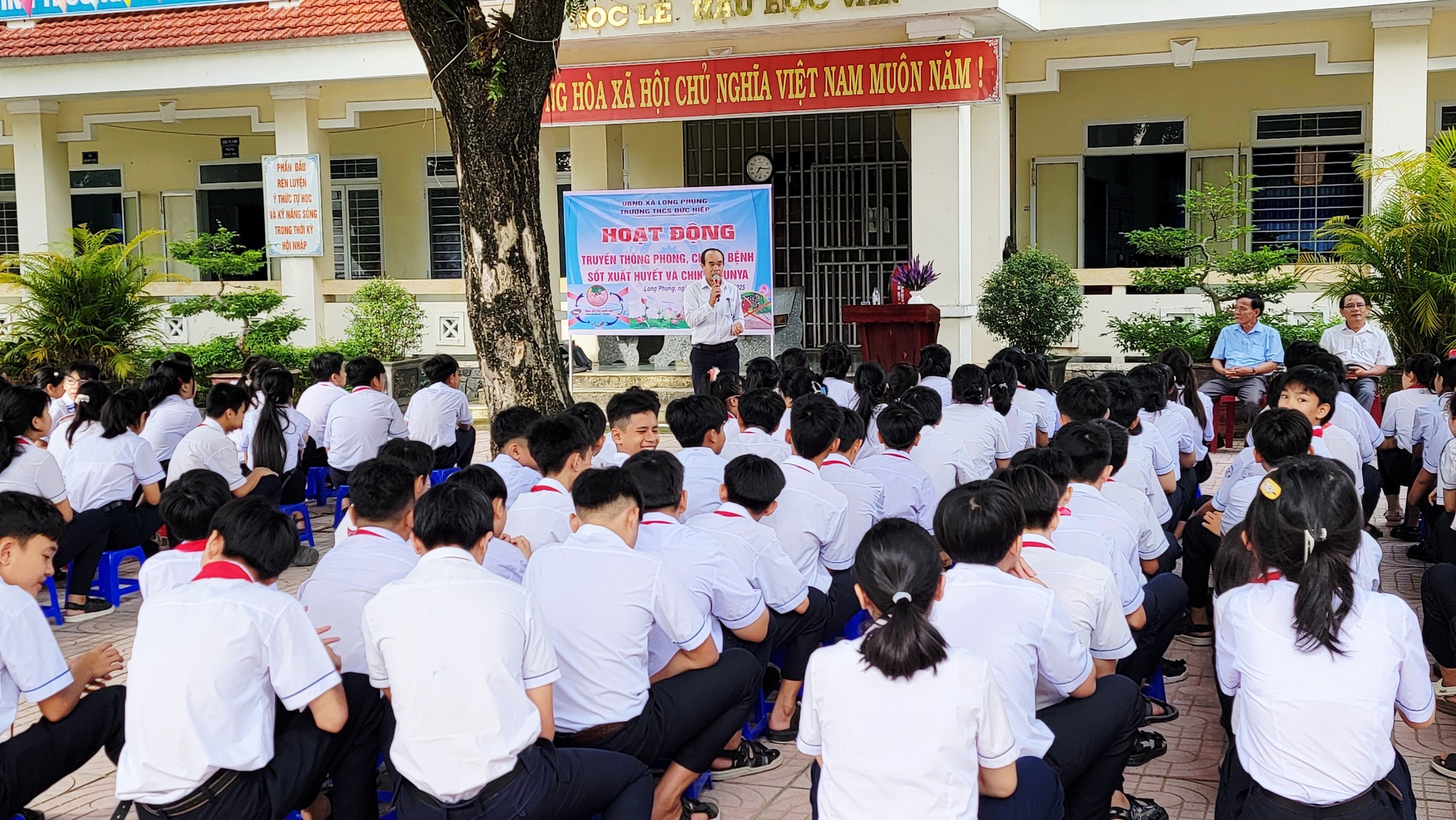 Hoạt động truyền thông phòng, chống dịch bệnh sốt xuất huyết. Sáng ngày 25/09/2025 tại Liên đội, Trung tâm phòng, chống dịch bệnh Tỉnh Quảng Ngãi về có buổi giao lưu tuyên truyền Bệnh sốt xuất huyết và Chikungunya cho hơn 300 học sinh và toàn thể CBGVNV trong nhà trường. Qua buổi giao lưu, tuyên truyền các em không những có được kiến thức về nguyên nhân của bệnh sốt xuất huyết mà còn biết cách hướng dẫn mọi người cách phòng tránh dịch bệnh hiệu quả.