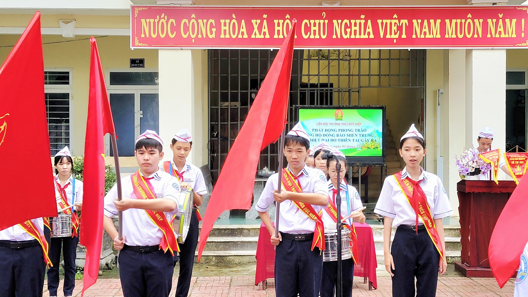 Hưởng ứng thư kêu gọi của Ủy ban Mặt trận Tổ quốc Việt Nam và phát huy truyền thống “tương thân tương ái”, “lá lành đùm lá rách” của dân tộc ta. Sáng nay, ngày 01/12/2025 trong giờ chào cờ, Liên đội trường THCS Đức Hiệp đã tổ chức phát động quyên góp ủng hộ đồng bào các tỉnh miền Trung – Tây Nguyên đang gặp nhiều khó khăn do thiên tai gây ra.